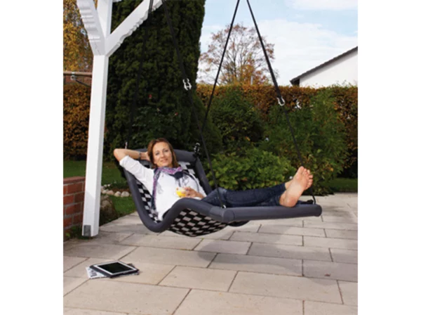 Größe L mit Aluminiumrahmen, Streifenbespannung und dunkelgrauem Aufprallschutz. Standard-Seilset als 2-Punkt-Aufhängung; dynamische Belastbarkeit ca. 200 kg. Varianten in mehreren Farbkombinationen.