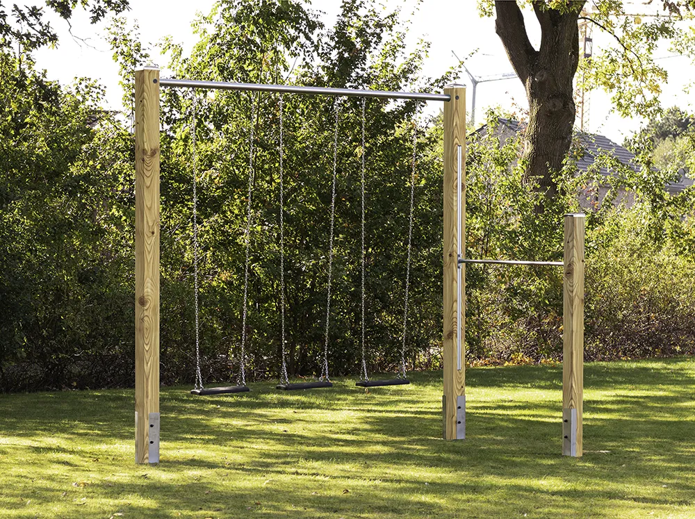Die Kombination aus Einzel-, Doppel- oder Dreierschaukel mit Turnreck im 90°-Winkel aus lasierten Leimbindern Lärche verbindet natürliche Optik mit klar strukturiertem Bewegungsraum. Durch die rechtwinklige Anordnung entstehen getrennte Spielbereiche für Schaukeln und Turnen. Stufenlos höhenverstellbares Turnreck, zwei Schaukelhöhen (2,50 m oder 3,00 m) und langlebige Edelstahl-Komponenten sorgen für Stabilität, Flexibilität und ganzjährigen Outdoor-Einsatz – belastbar bis 150 kg pro Person und geprüft nach DIN EN 71-8.