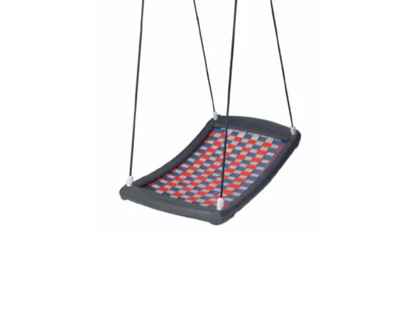 Serie Education M (109 x 53 cm). Aluminiumrahmen, dichtes 40-mm PP-Ripstop, umlaufender Aufprallschutz. Seilset Pro (2-Punkt) ca. 1,80–2,80 m, für Innenräume in Kitas und ähnlichen Einrichtungen geeignet, EN 1176-1/2. Belastbarkeit 150 kg (dynamisch 300 k