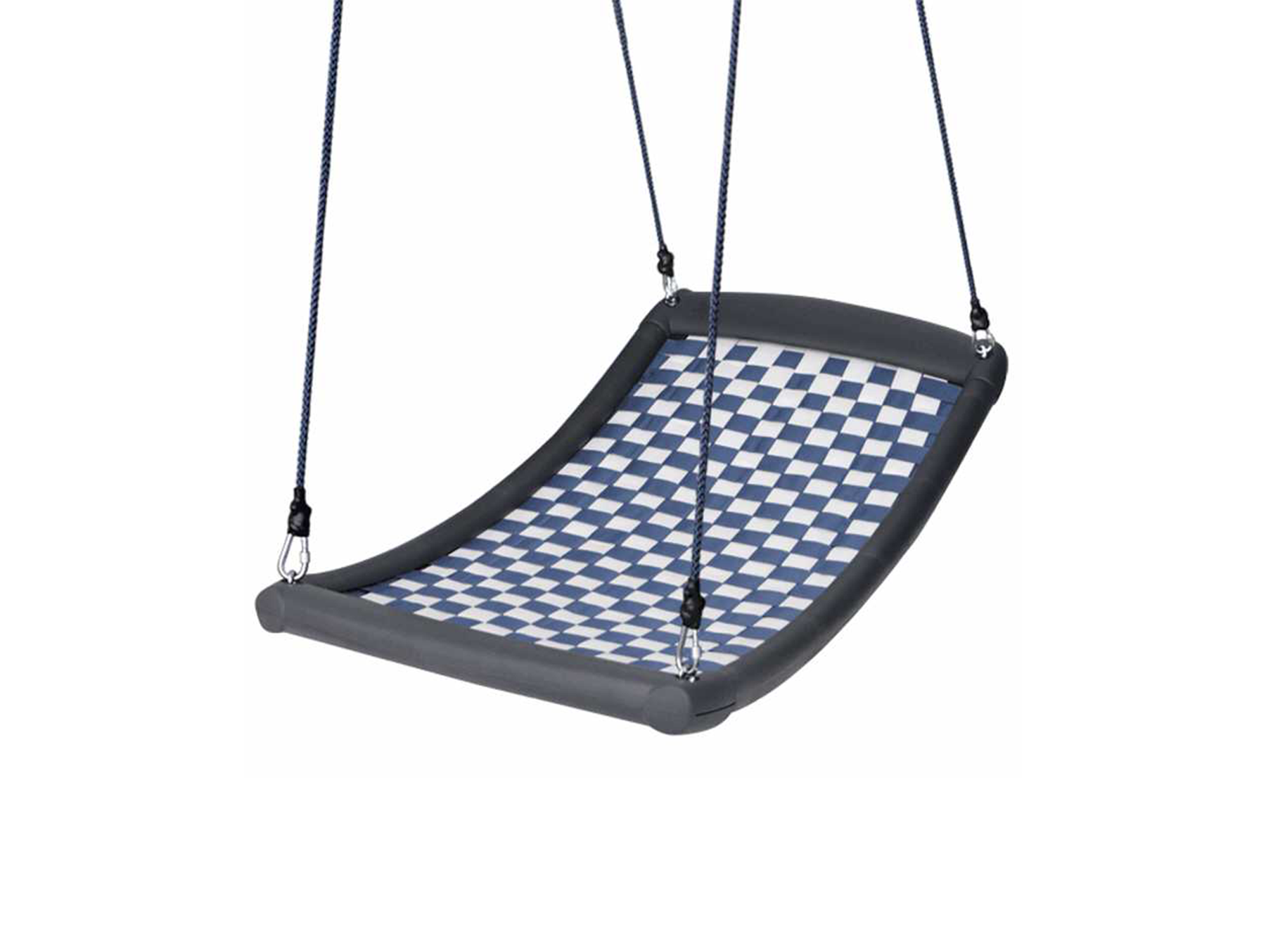 Große Ultra-Variante für 136 x 66 cm. Aluminium-Rahmen, 40 mm PP-Ripstop-Bespannung, dunkelgrauer Aufprallschutz; Seilset Standard als 2-Punkt-Aufhängung aus 10-mm Polypropylen, bis 2,80 m. Bausatz mit Ultra-Zubehör (2× Marathon, SwingGo); Farbschemata je