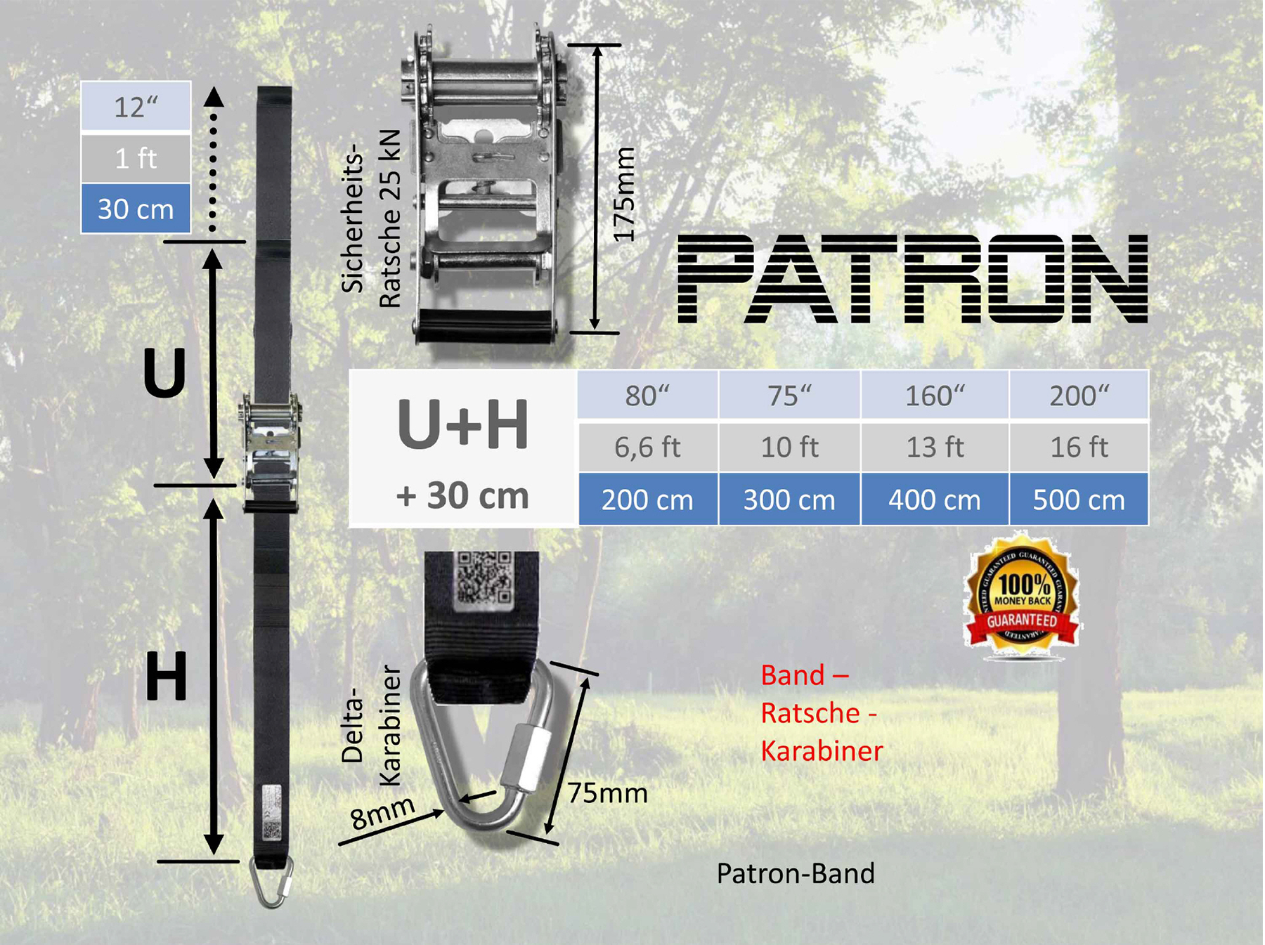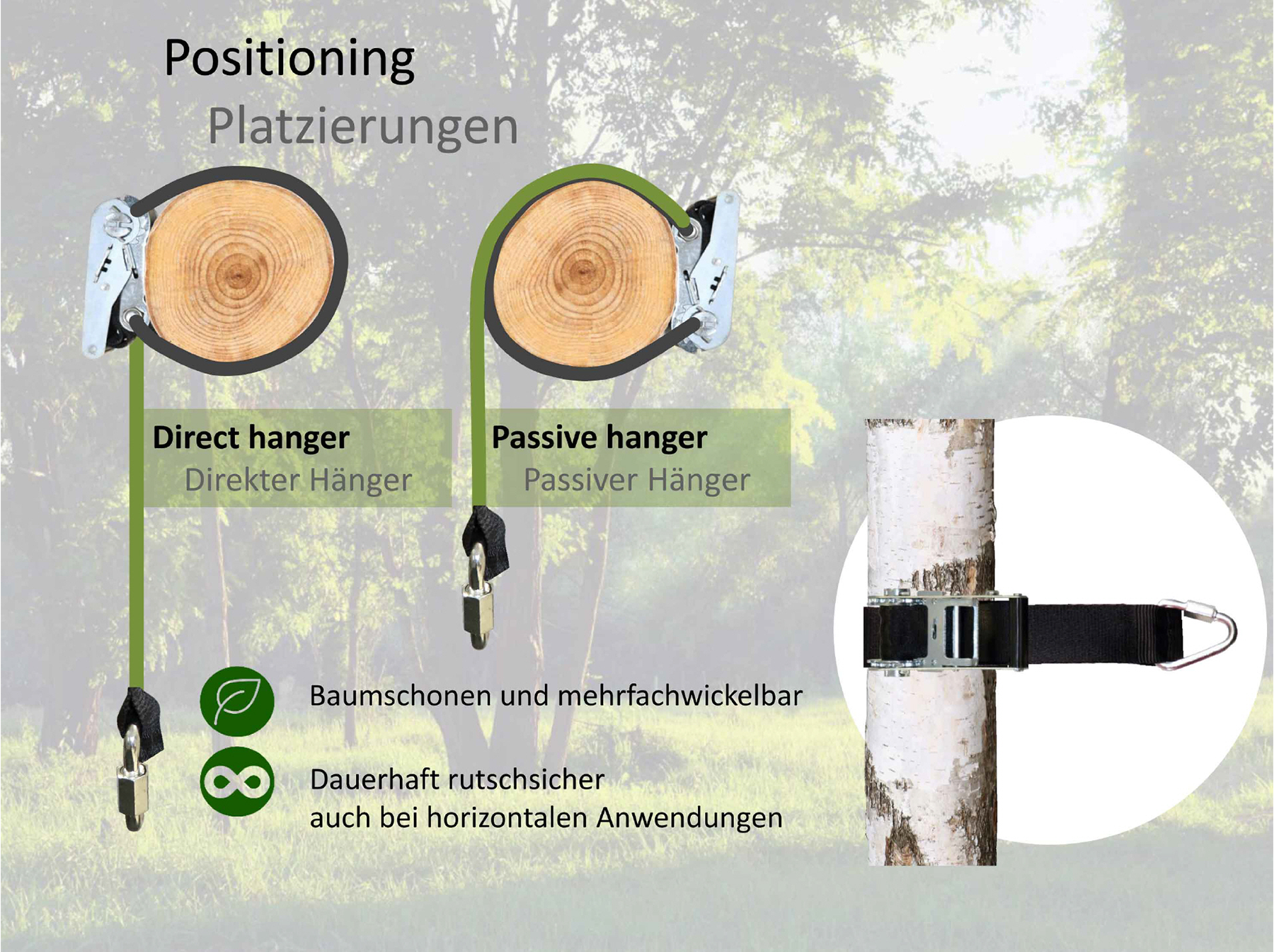 Band-Set mit Ratsche für das einseitige Spannen am Baum; 50-mm Polyesterband inkl. Delta-Karabiner/Verbindungsglied. Für schnelle, stabile Fixierung hängender Geräte.