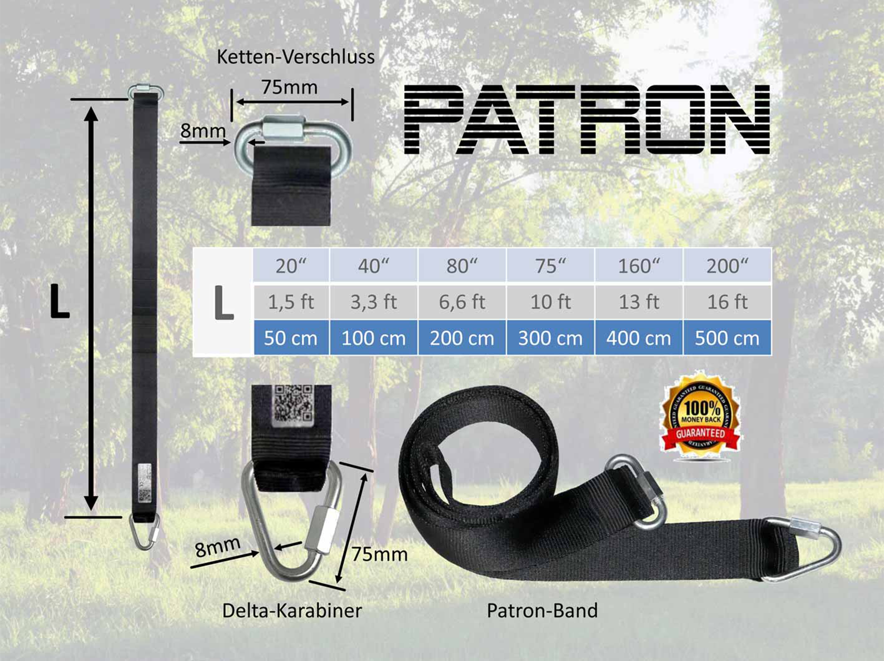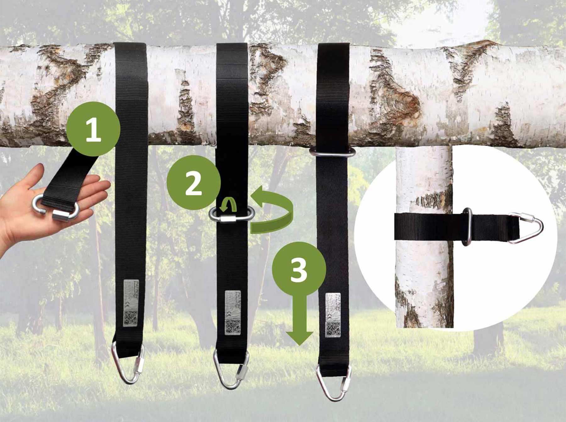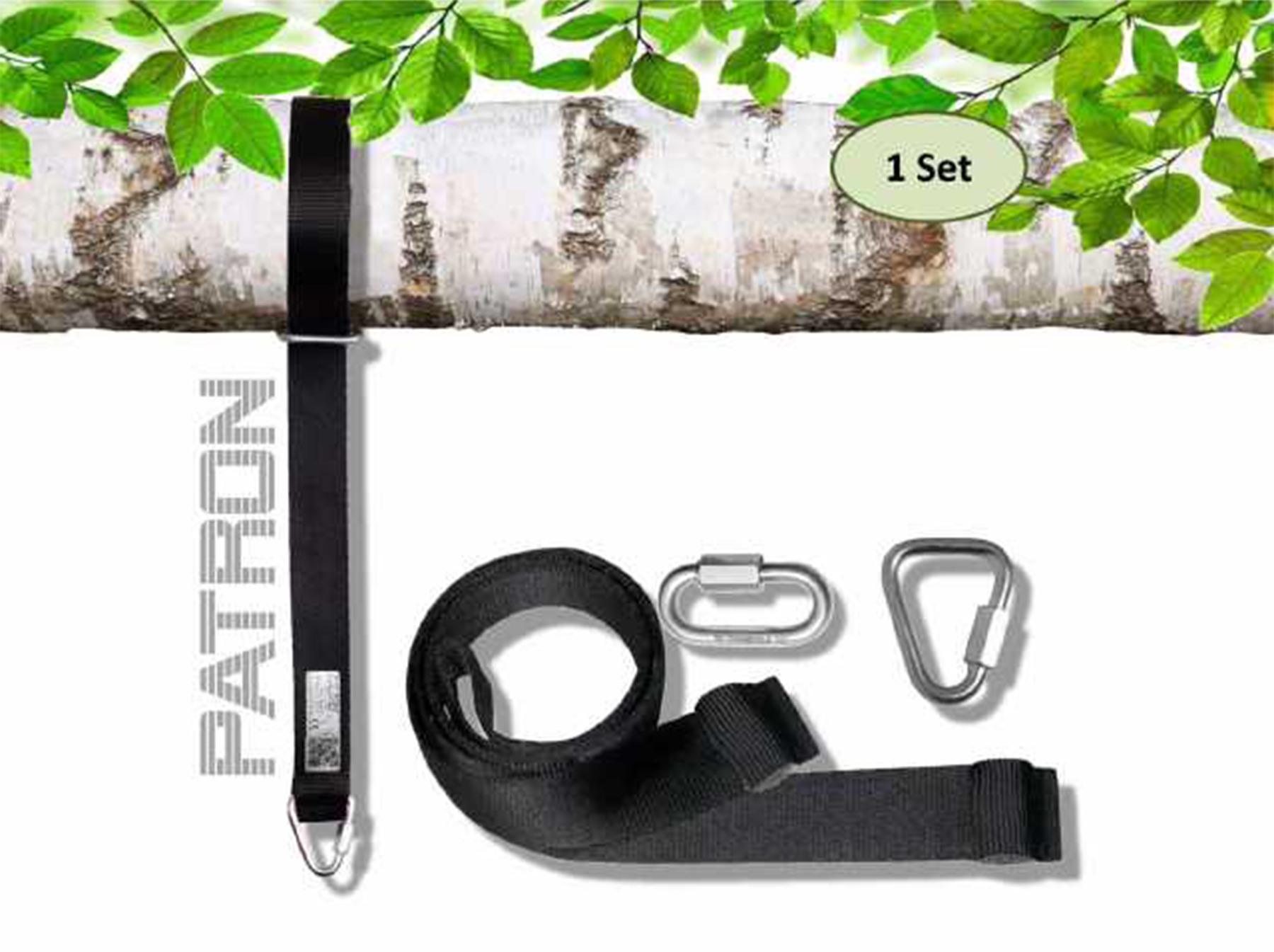 Selbst zuziehende Bandschlinge aus 50-mm Polyester zum Umreifen von Bäumen/Trägern. Schnelle, bohrfreie Montage; kompatibel mit PATRON-Karabinern und Ratschen.