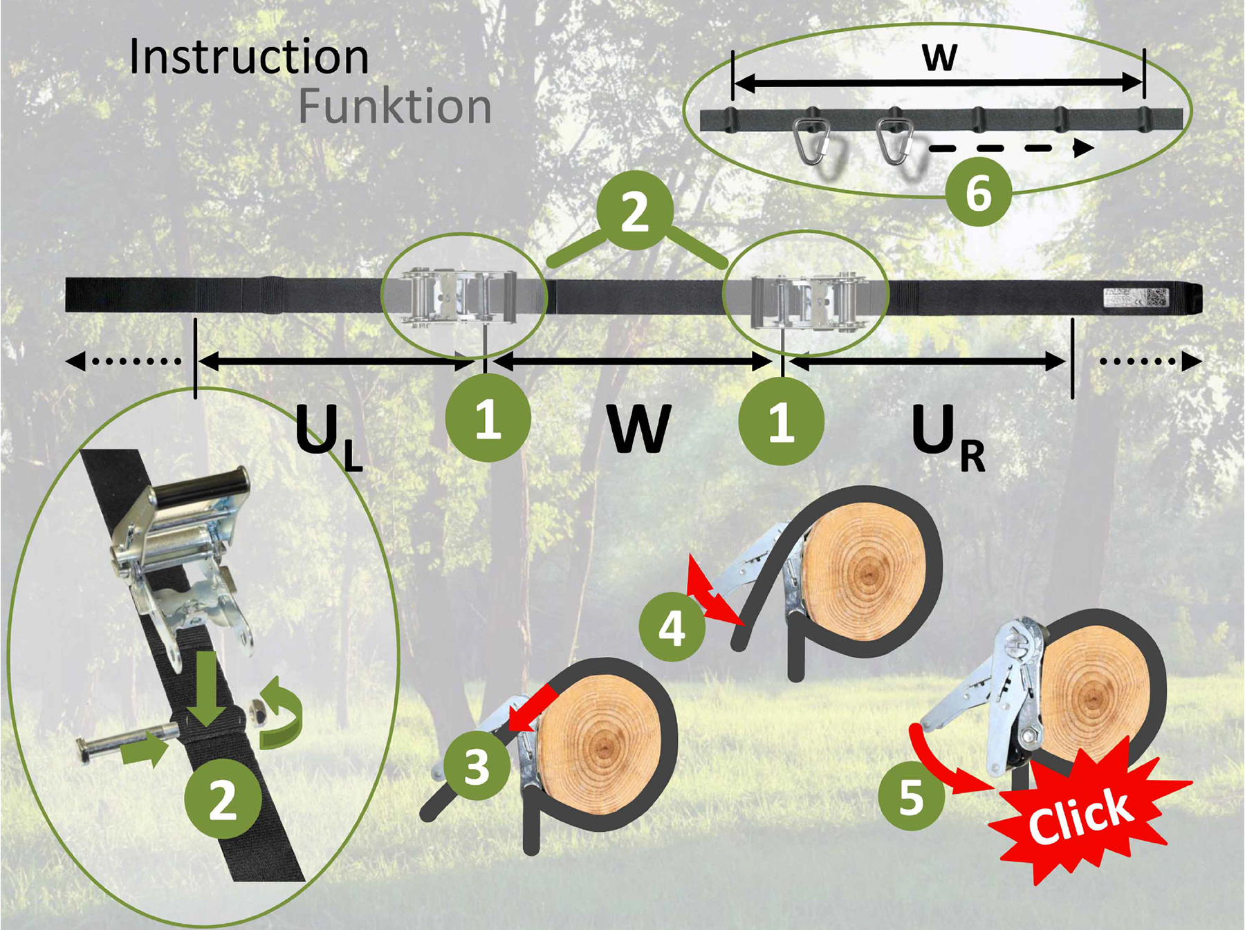 Sicherheitsvariante des Between: doppelt geführtes 50-mm Band mit parallel laufendem Sicherungsband; insgesamt 4 Ratschen. Verhindert das Herabfallen des Hauptbandes bei Entlastung.