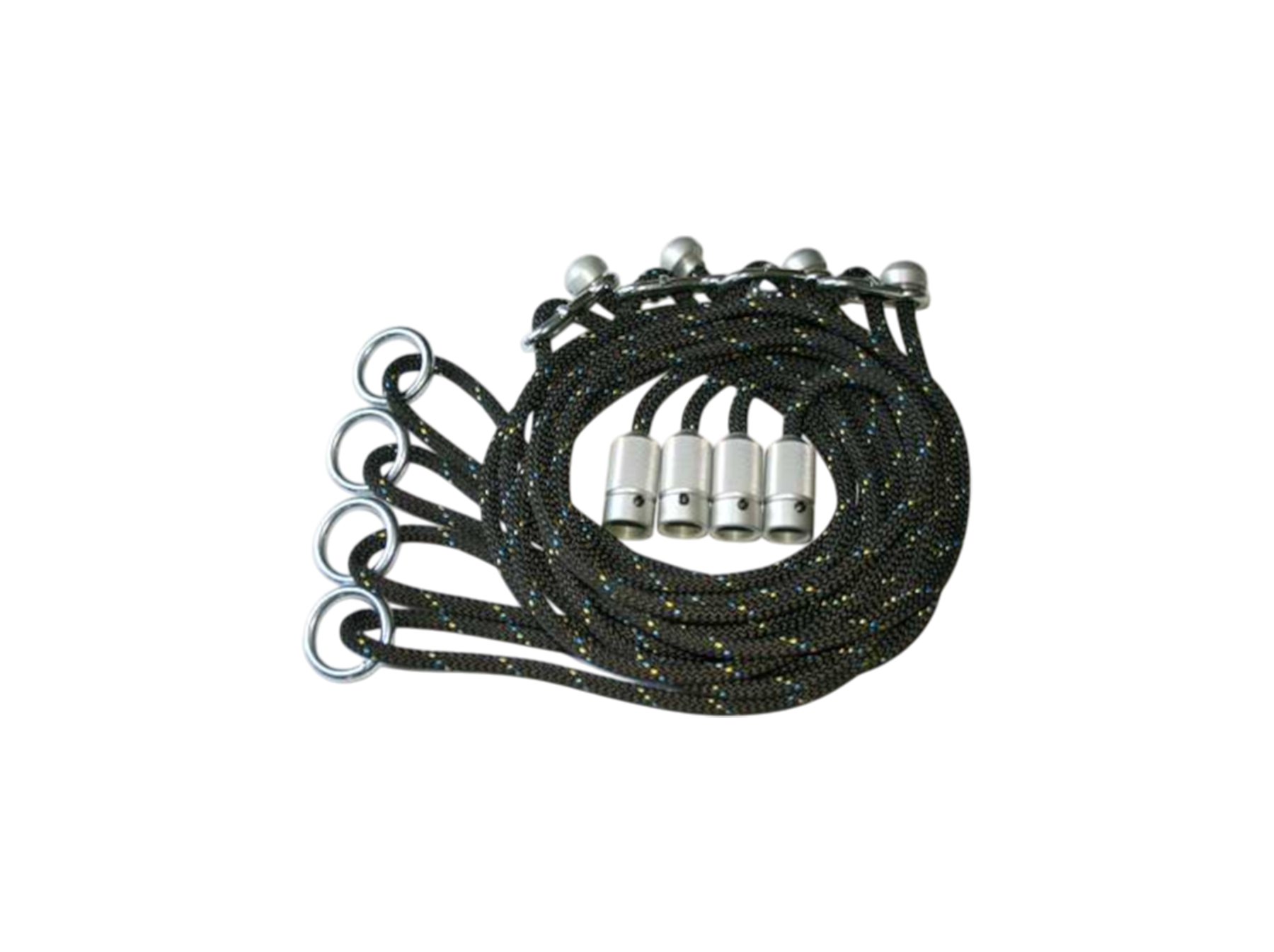 4-Punkt-Aufhängeset für geeignete Schaukelmodelle (z. B. Therapie/Plattform). PES-Seile 10 mm mit Sicherheitsverschraubung; inkl. Stellachten und Schaukelringen.