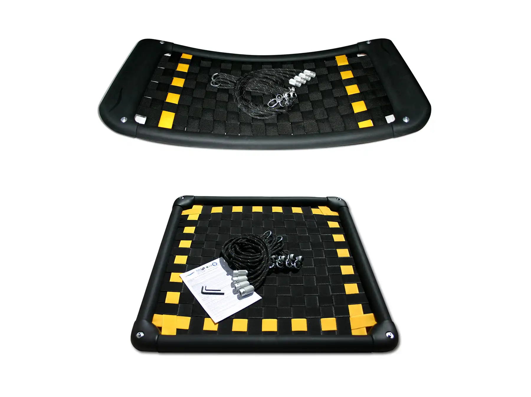 Set aus zwei Therapieschaukeln: TherapiePlus L (136 x 66 cm) und PlattformPlus L, quadratisch (100 x 100 cm). Lieferzustand: einsatzbereit/vormontiert; inkl. Seilset Pro in schwarz mit 4-Punkt-Aufhängung bis 3 m. Farbkombination: schwarz mit Orientierungs